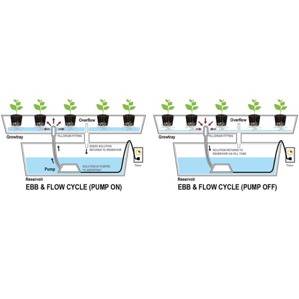 Hydroponic ebb and flow trays uses pumps and a large water reservoir to periodically flood the plant